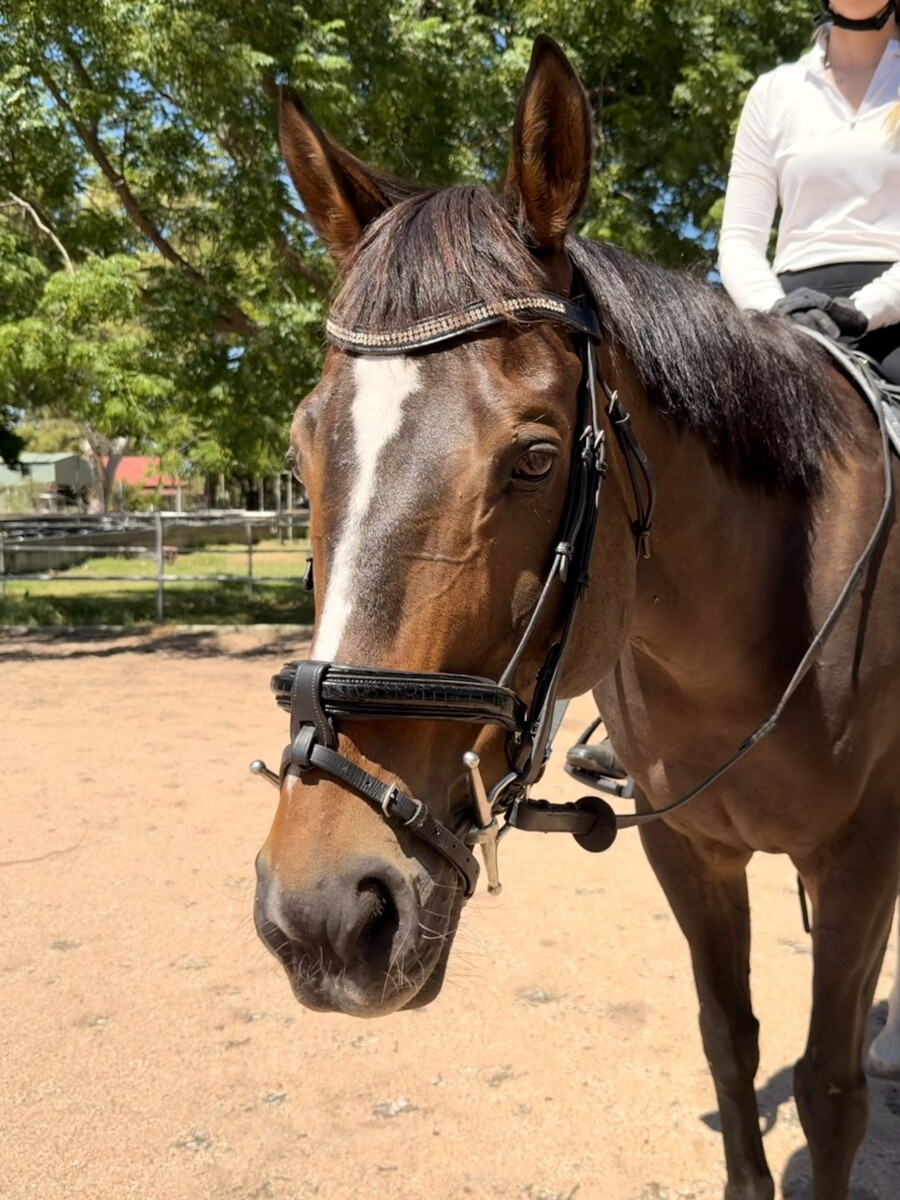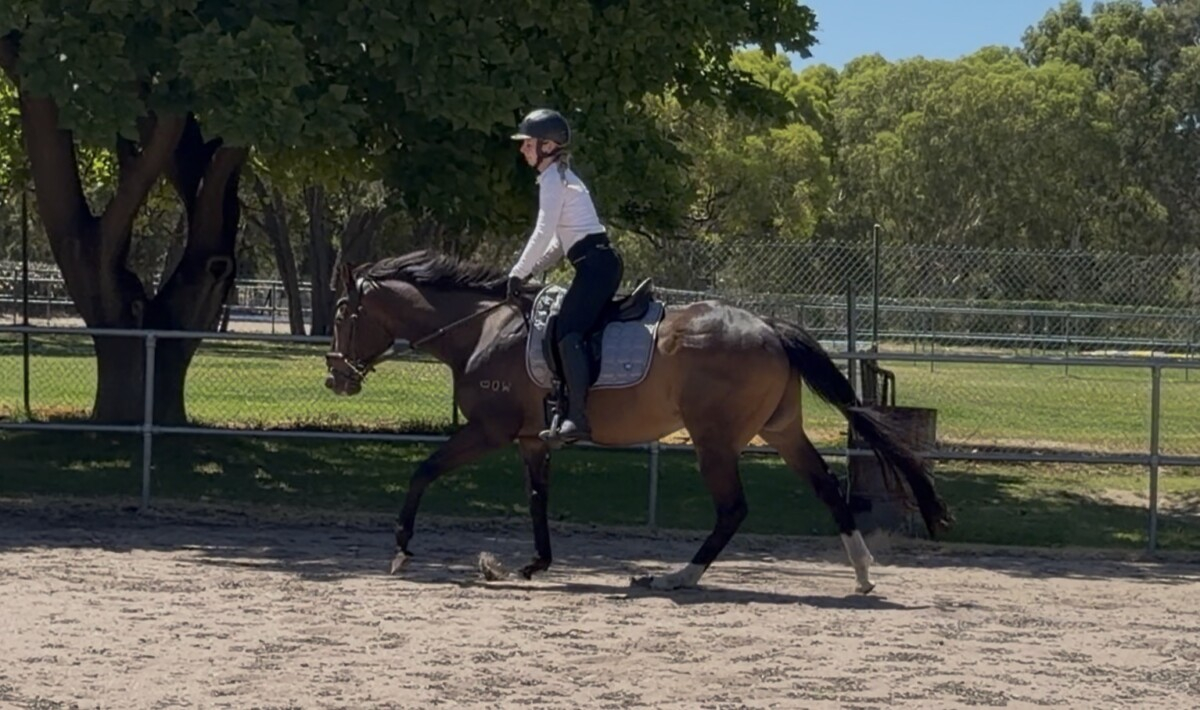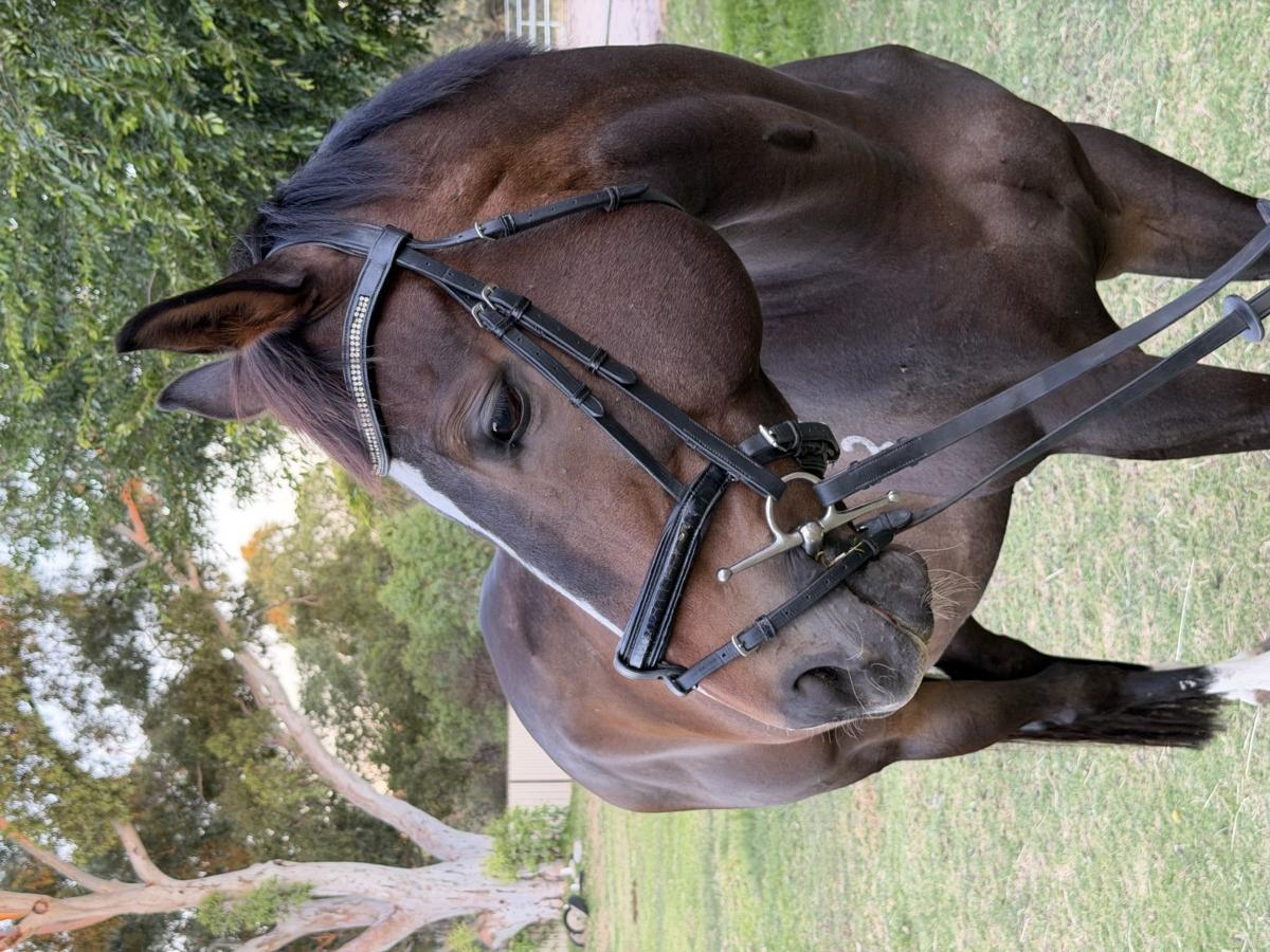 Roley has started learning to bend his body and be on the bit. He showed promise as an eventer as he will go through any puddle and was not fazed by fill when he started jumping. He did have a bit of get up and go when he was fitter but has mellowed more as he aged. Has only been off the property for road walks and spelling but has been easy to handle on all occasions. Lovely soft mouth going in a French link snaffle.