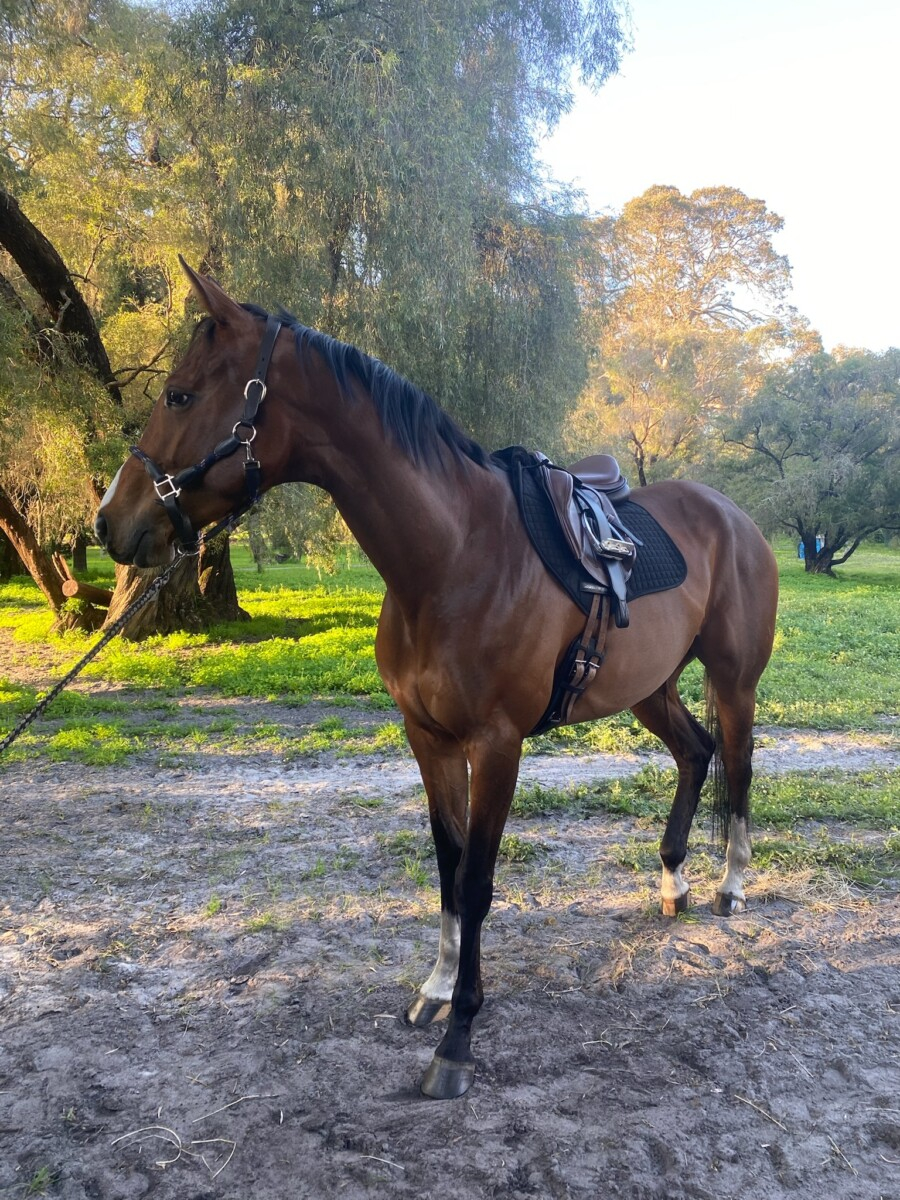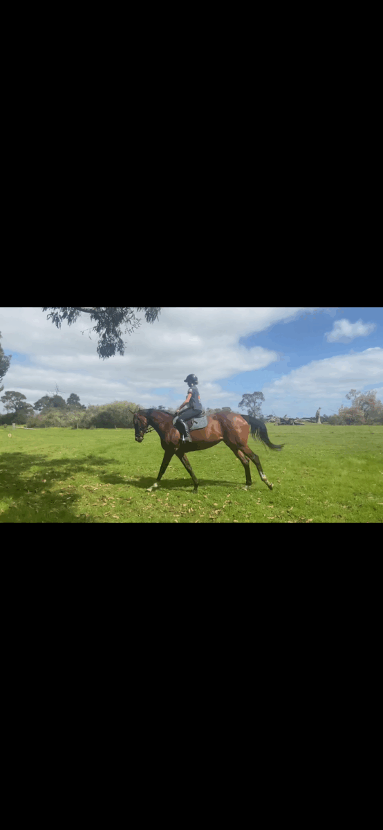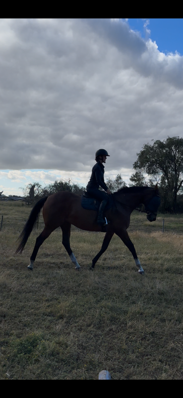 Professionally started and produced, she has established walk, trott and canter in a soft contact and shows a springy, athletic jump. She shows promise with rhythm and balance in her paces with more whoa than go.