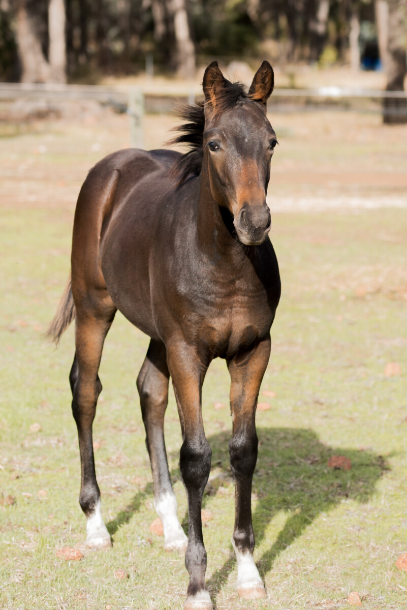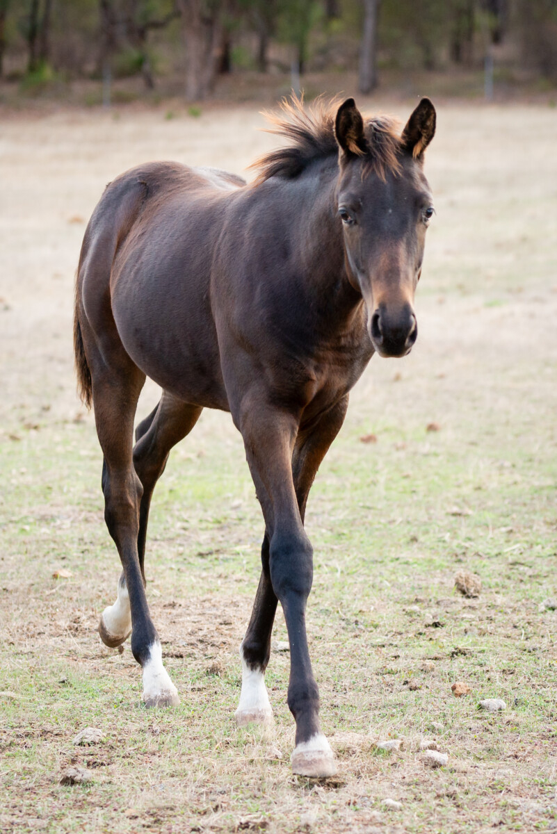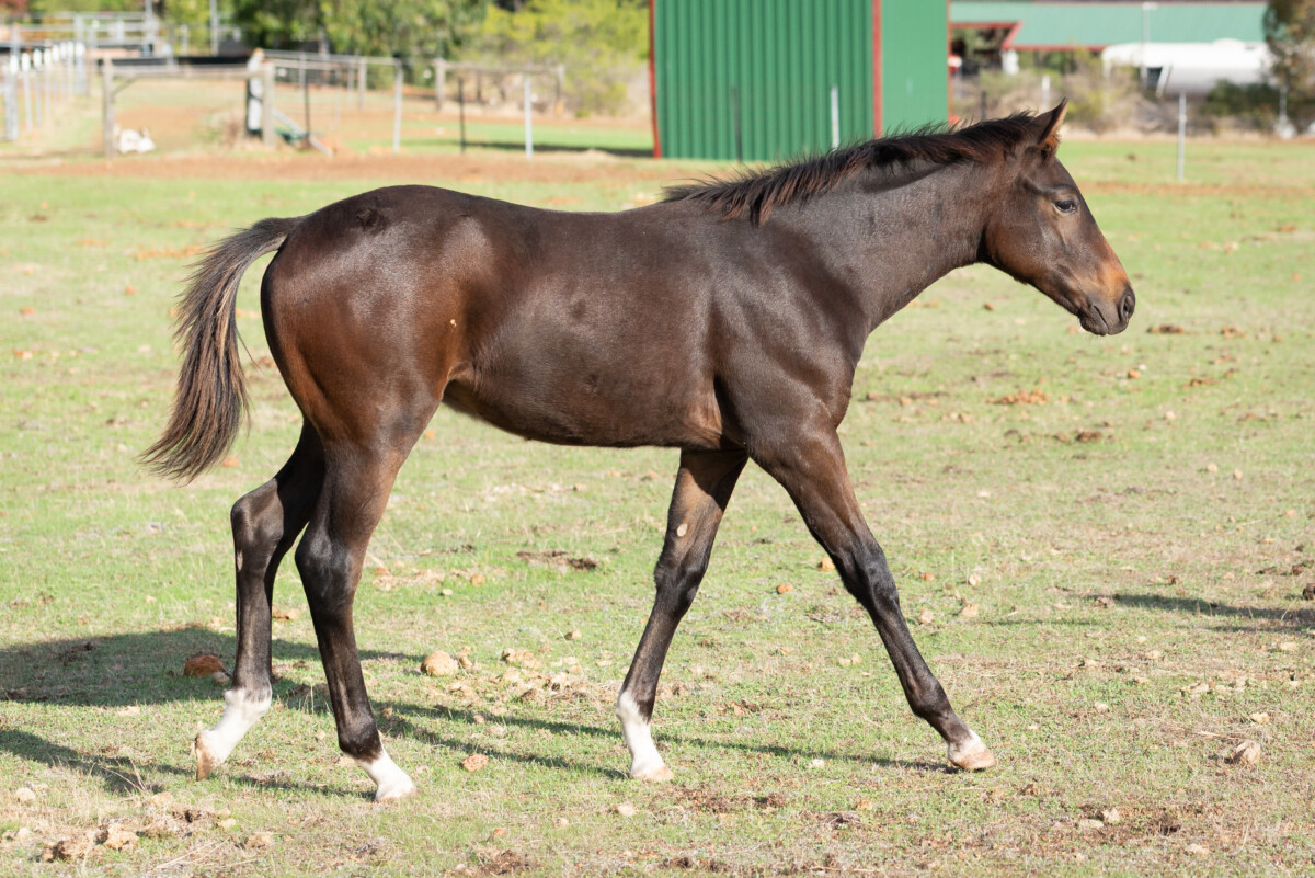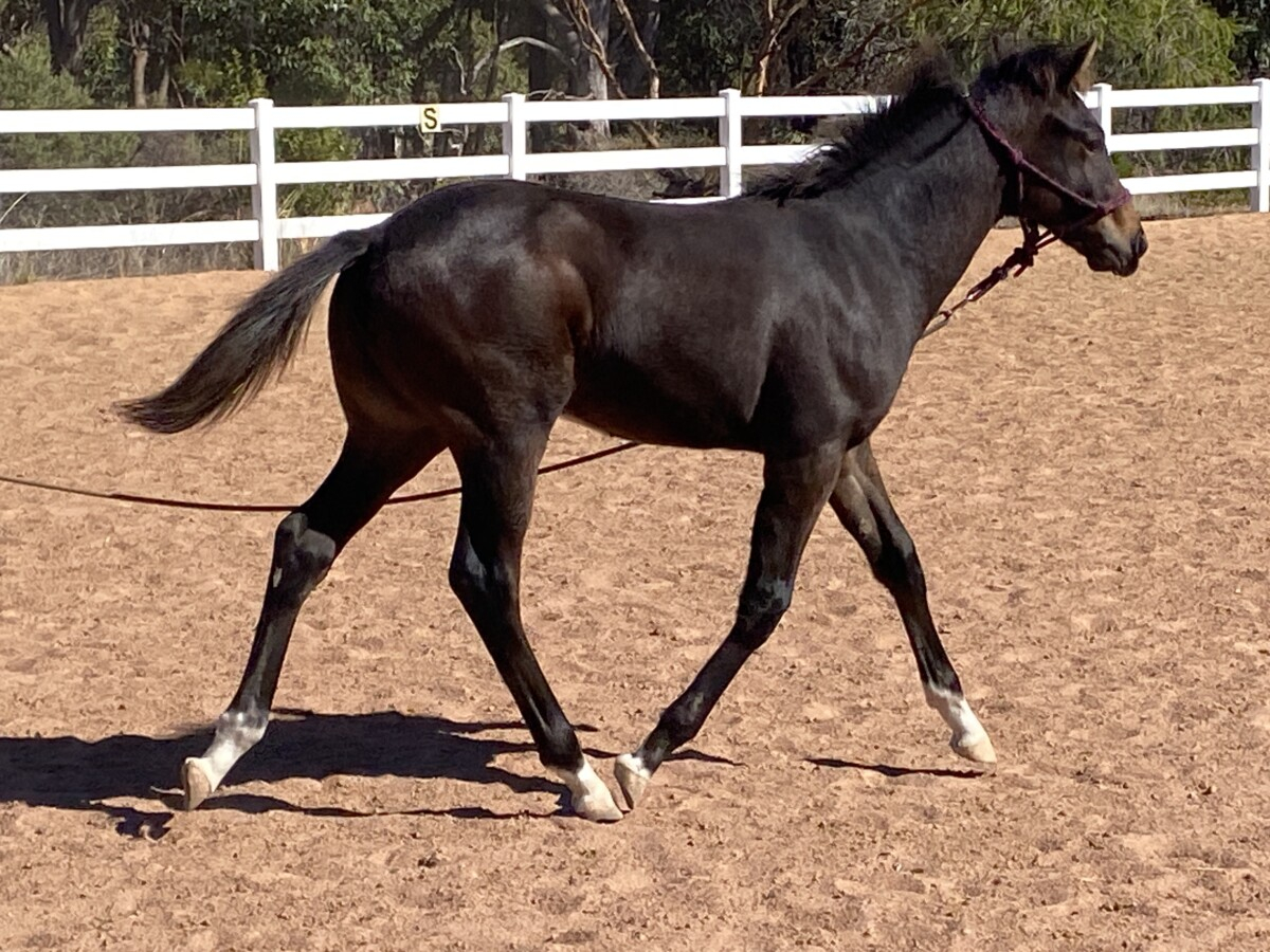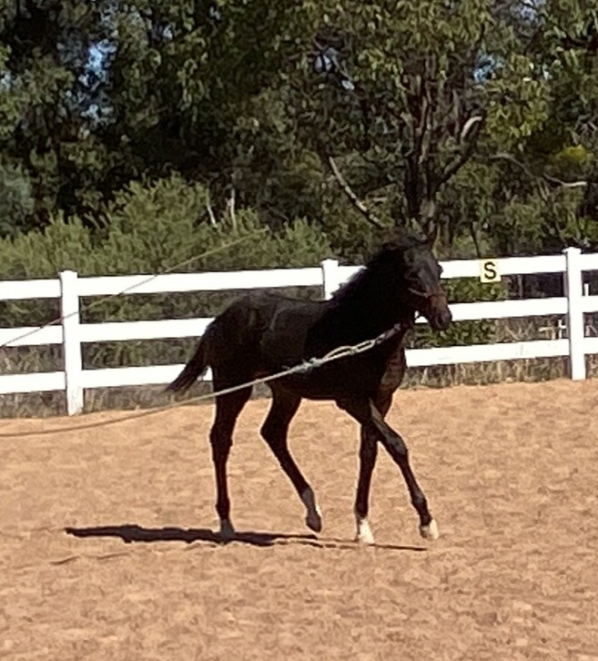 Ka -Ching is 6, months old and ready to find his new home, He has lovely straight legs with 4 white socks. his conformation is correct and has a loverly flowing movement. Stunning dark mahogany brown he is going to stand out in any dressage or show arena He will have speed and jumping ability His dam is super quiet and so sensible she is my horse that I chose to ride after having multiple surgeries on my back and taking 2 years off {at the age of 63}.