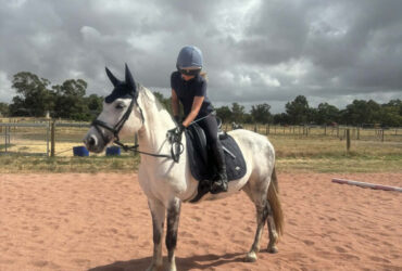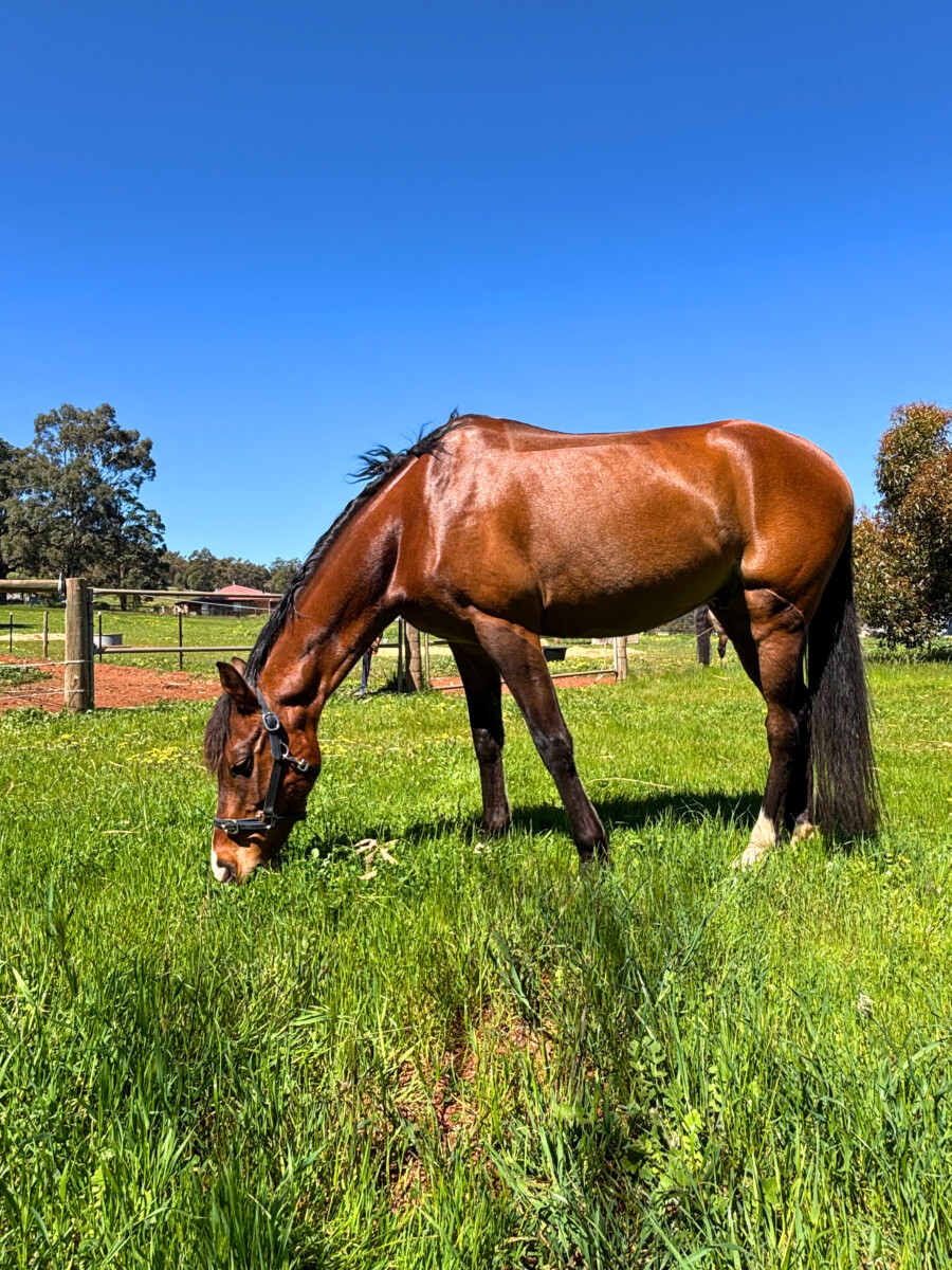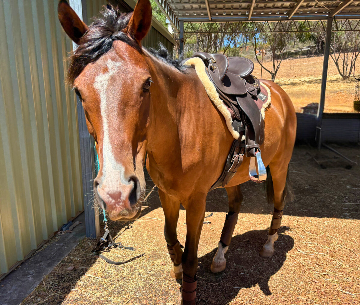 He has plenty of experience with trail riding. While his previous owner often took him out both alone and with groups, I’ve noticed he tends to be more apprehensive when I ride him solo—most likely because I’m less experienced.