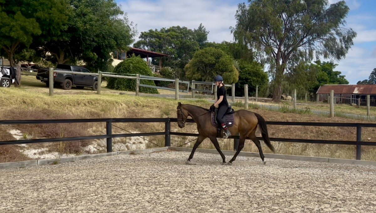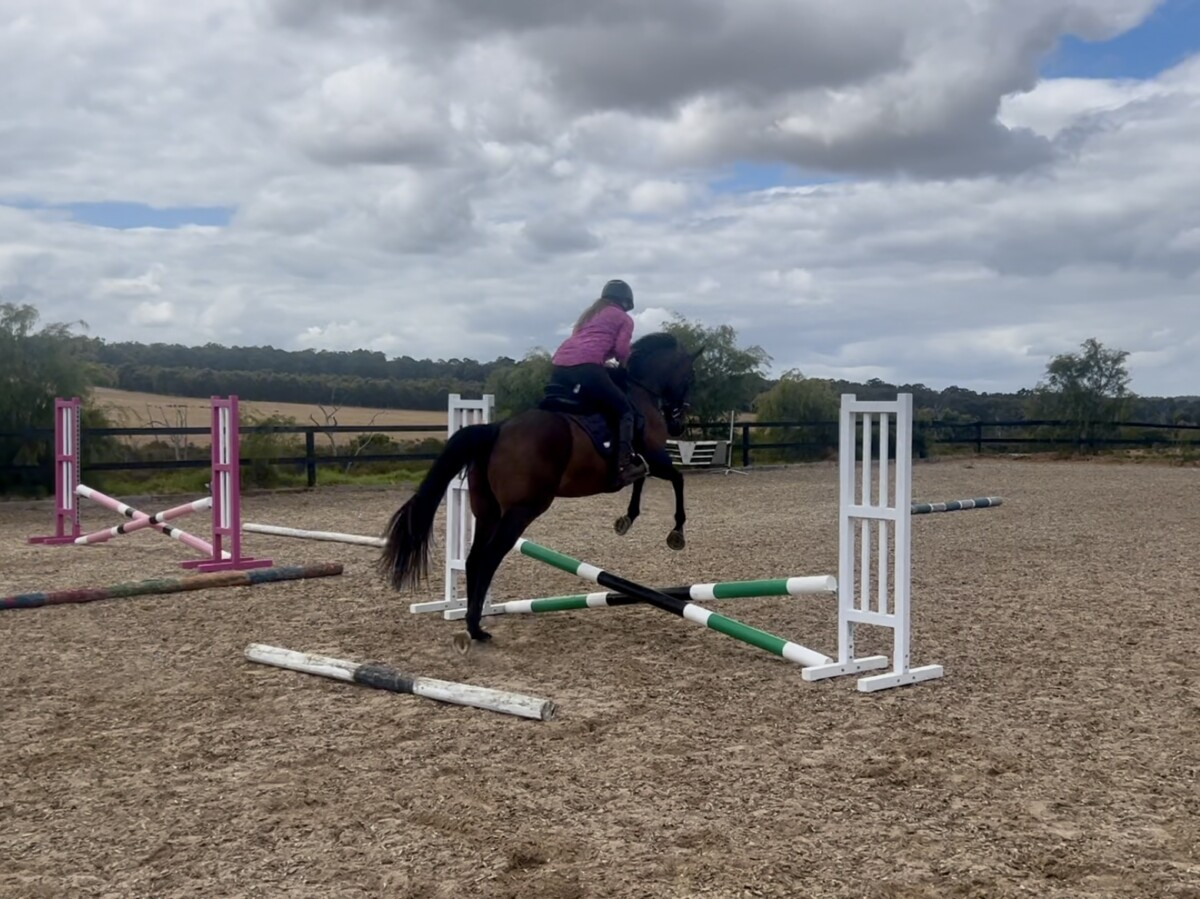 My passion is dressage and so he has only faced poles and small crosses however has never stoped or even looked at them. So has potential to show jump or event if that was your passion. He is starting to hold a consistent frame and has began some small lateral work.