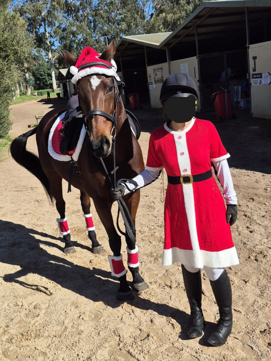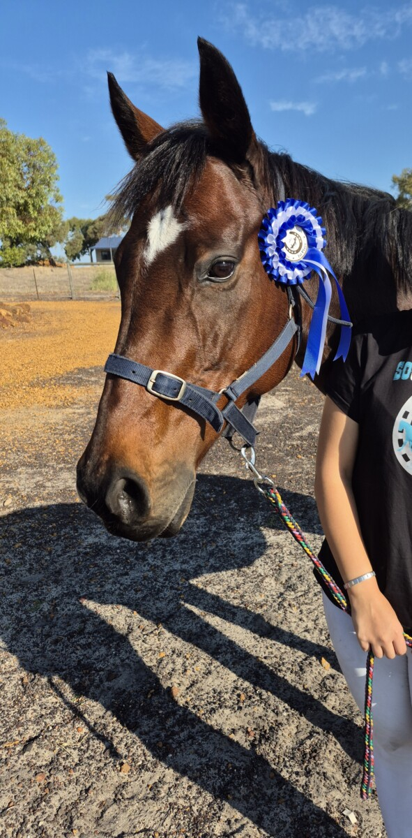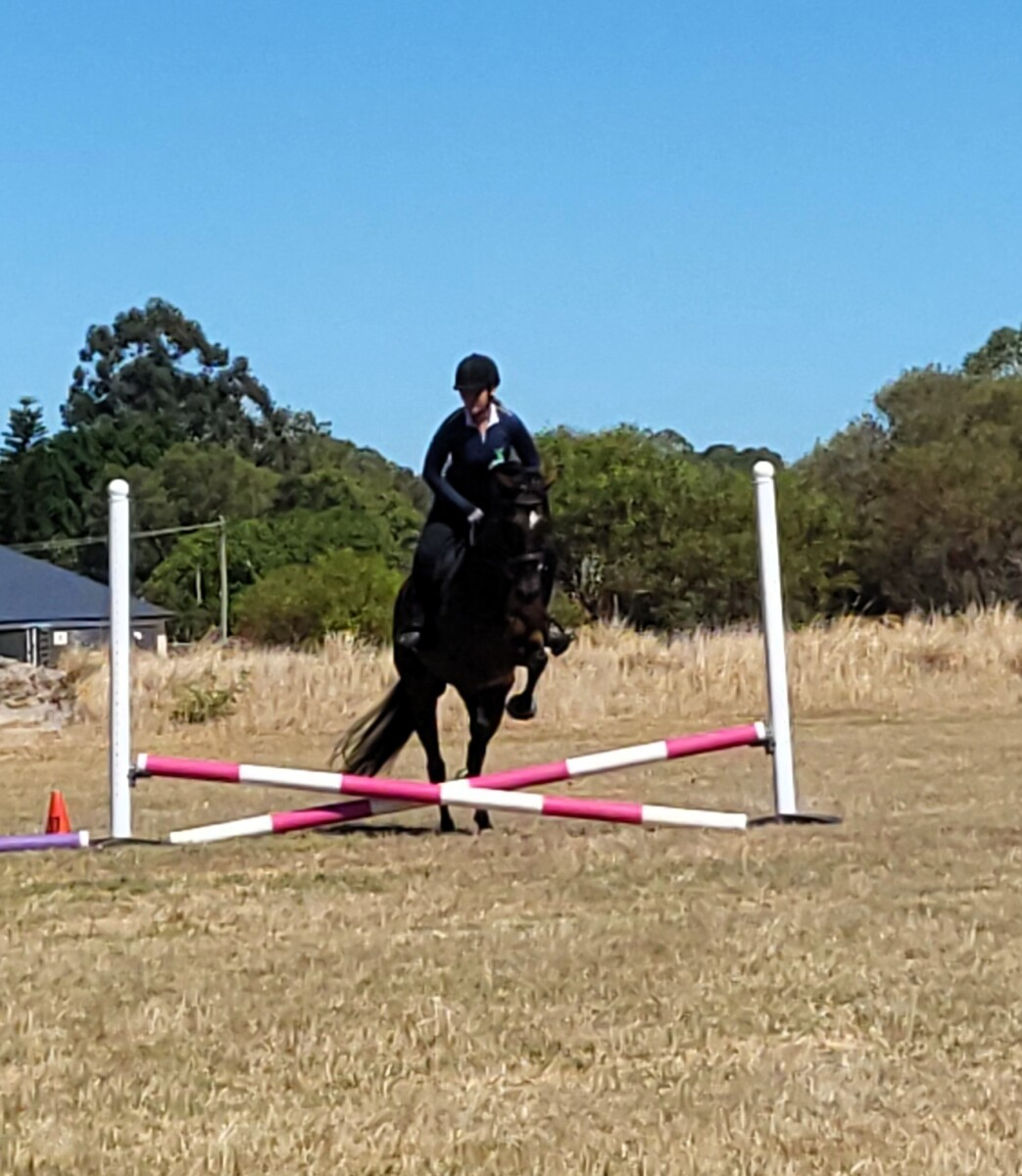 During her time with us, Maude has attended pony club, mixed training days, dressage competitions, including State-level, pony club camp, and various off‑property outings. She is easy to catch, float, shoe, worm and handle for the dentist, and she is fully up to date with all care. She is shod every six weeks on all four feet due to the rocky terrain on our property.