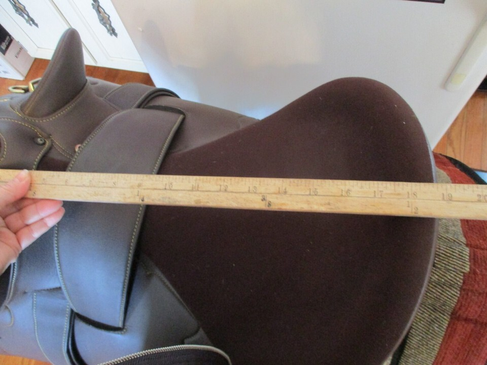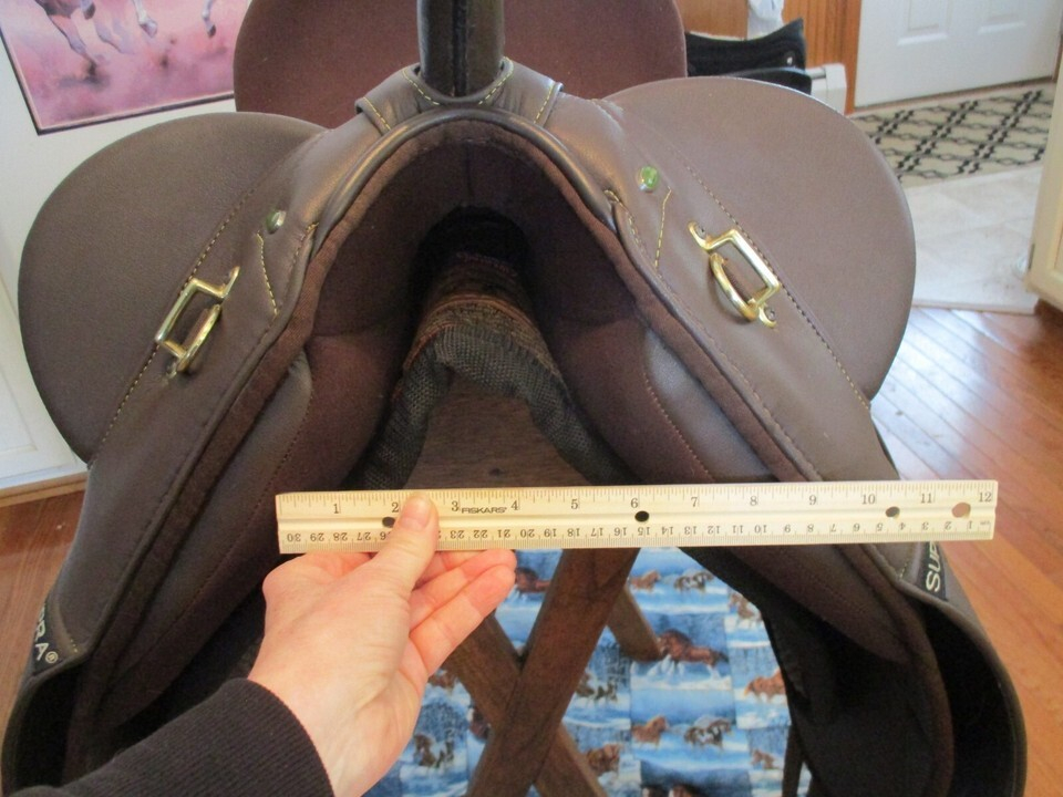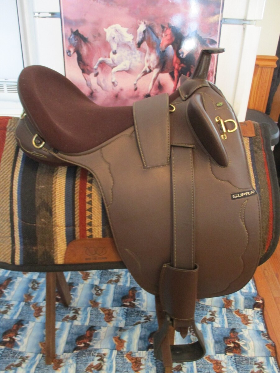 This fairly used 17" Supra Poly Synthetic Aussie saddle is priced for a quick sale as I no longer need it. Weighing just 17.2 lbs, this lightweight and easy-to-maintain saddle features a soft, supple finish and comes as a complete kit with the overgirth, straps, and stirrups with covers. With a 16" ear-to-ear measurement and 16 detailed photos showing exact ruler measurements of the gullet and tree, you can buy with total confidence in the fit. It’s a comfortable, ready-to-ride bargain perfect for your next trail adventure.