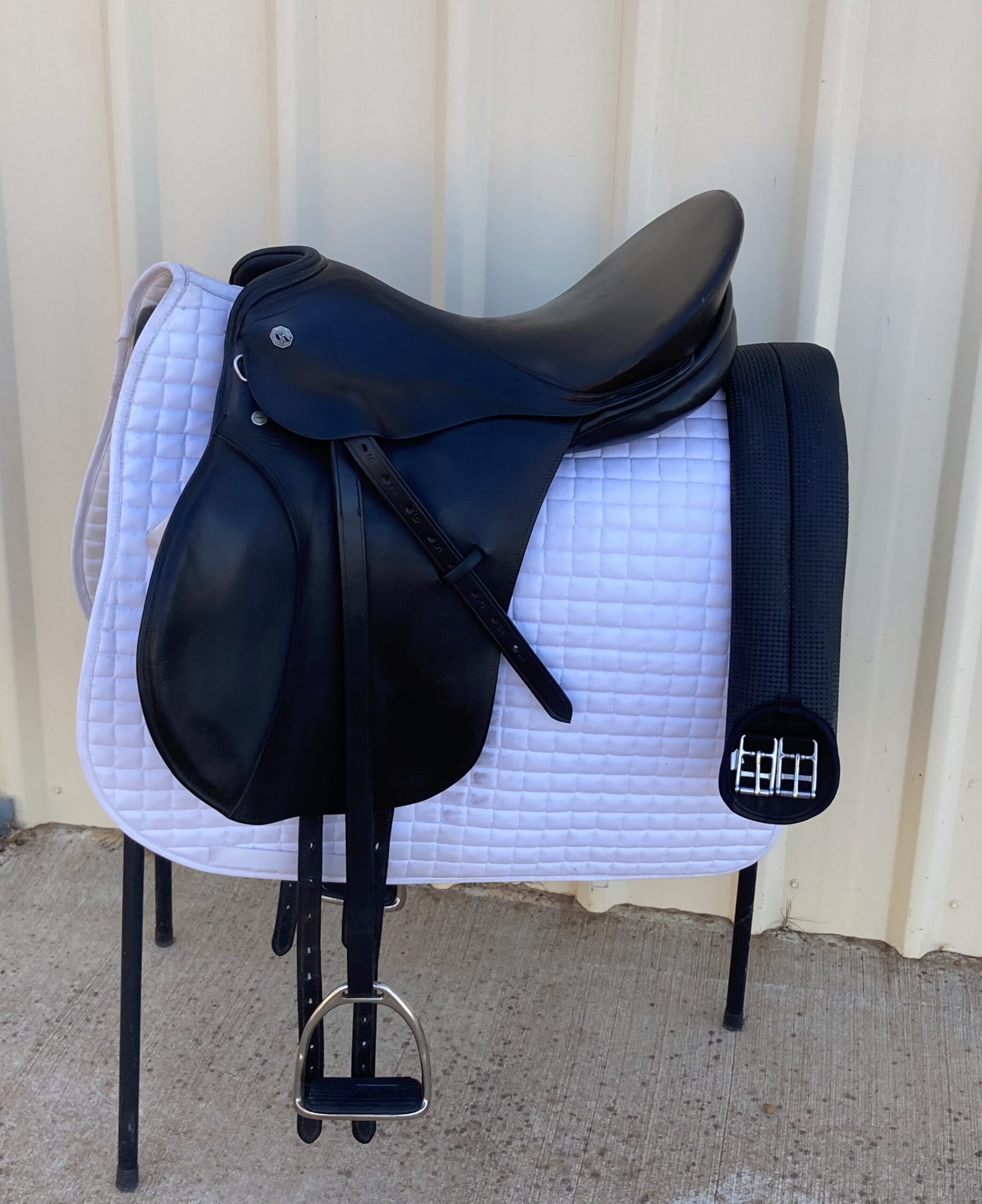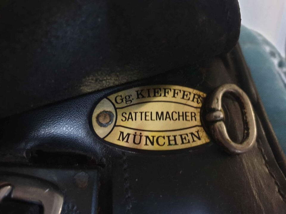 The saddle is manufactured by Georg Kieffer, München (Germany). As most of their saddles, particularly of those build a little more previously, it comes in solid, lasting full-grain leather. The saddle has a cut back pommel and sits on a tree with a medium-wide gullet. The seat is very comfortable with modest knee rolls, which does not jam the rider in but still gives enough stability to find your own leg position. The saddle comes fully mounted with stirrup leathers, stirrups and anti-chafe girth.