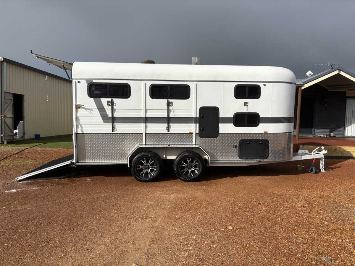 Horses: 3 bays, you can move the dividers as needed. Full length rug rack, swing out tack box for 3 saddles, bridles and fits heaps of other gear also. Outside pressurised tap. 2 outside storage boxes for feed, buckets, chairs etc.
