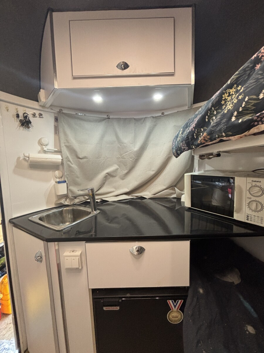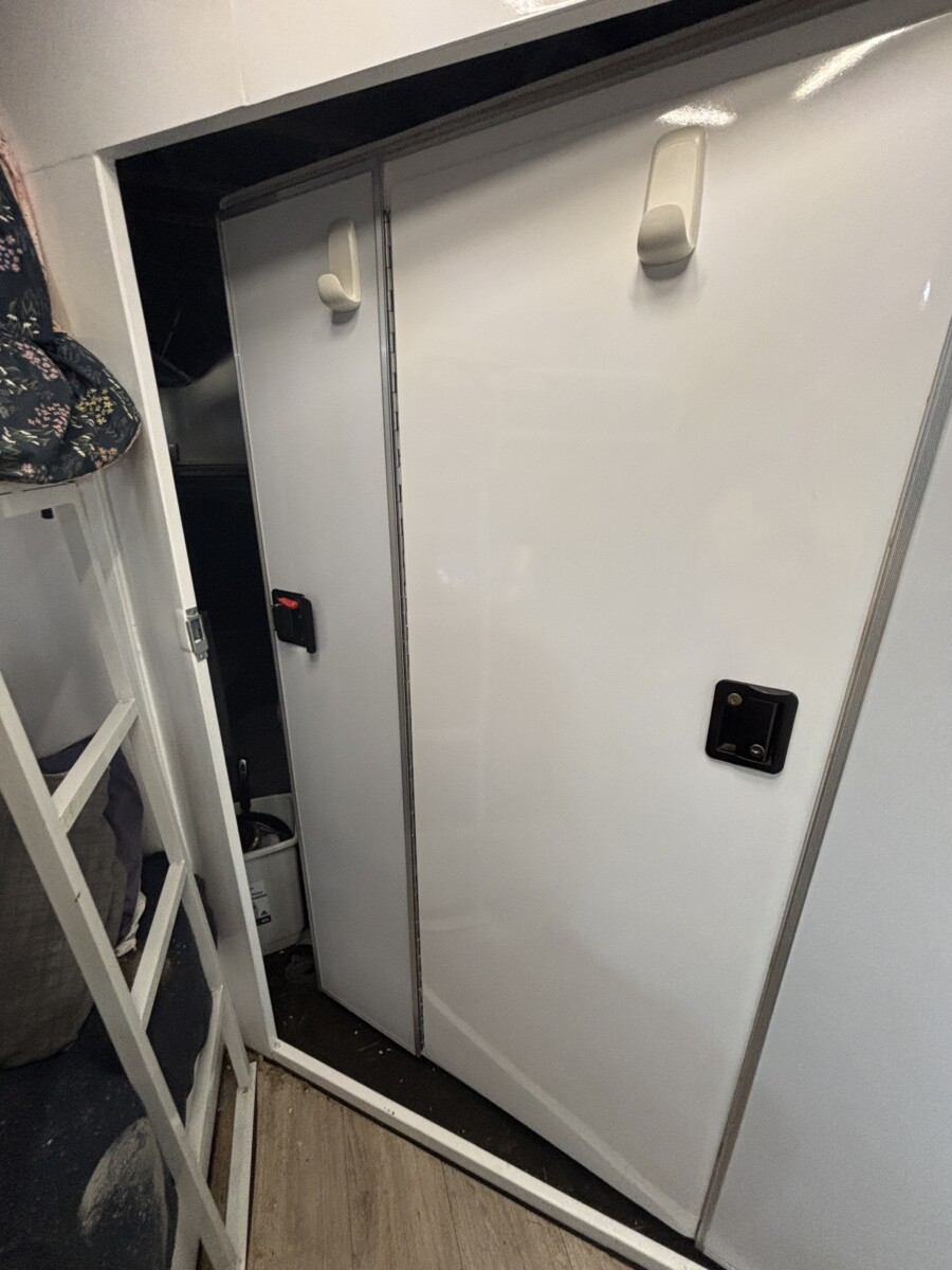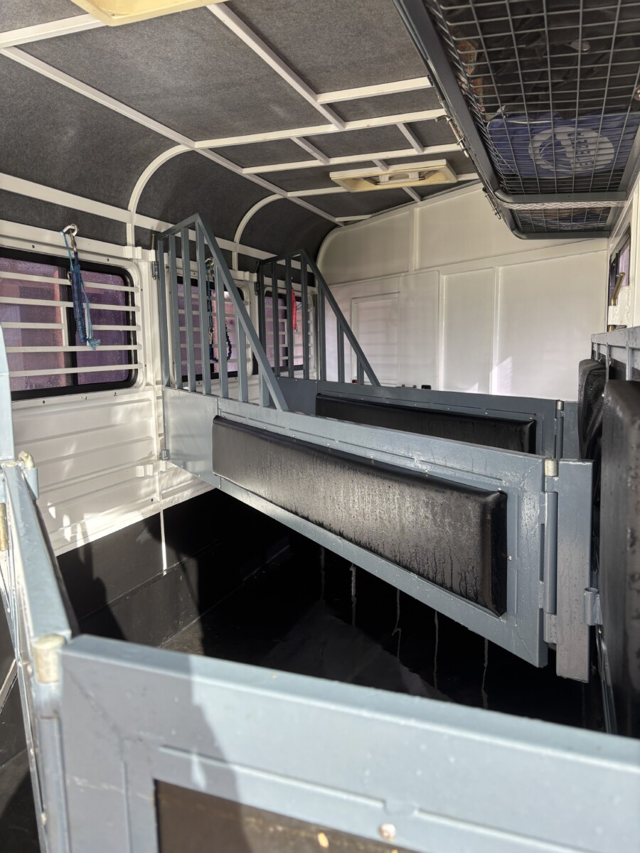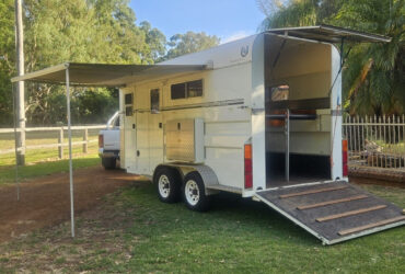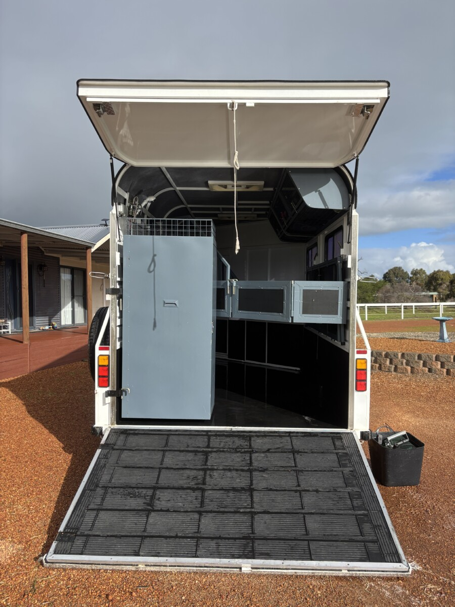 Living: Bunk beds, fridge, sink with hot water, microwave and kitchen storage. There is another drop down bed in the horse area also. Cowboy shower in horse area, the hot water is excellent! Battery was replaced last year and a better quality battery charger was also installed. The diving wall between the living and horse area swings right open so when you’re camping you can use the whole float. Plug in to mains power or a generator when you’re away camping.