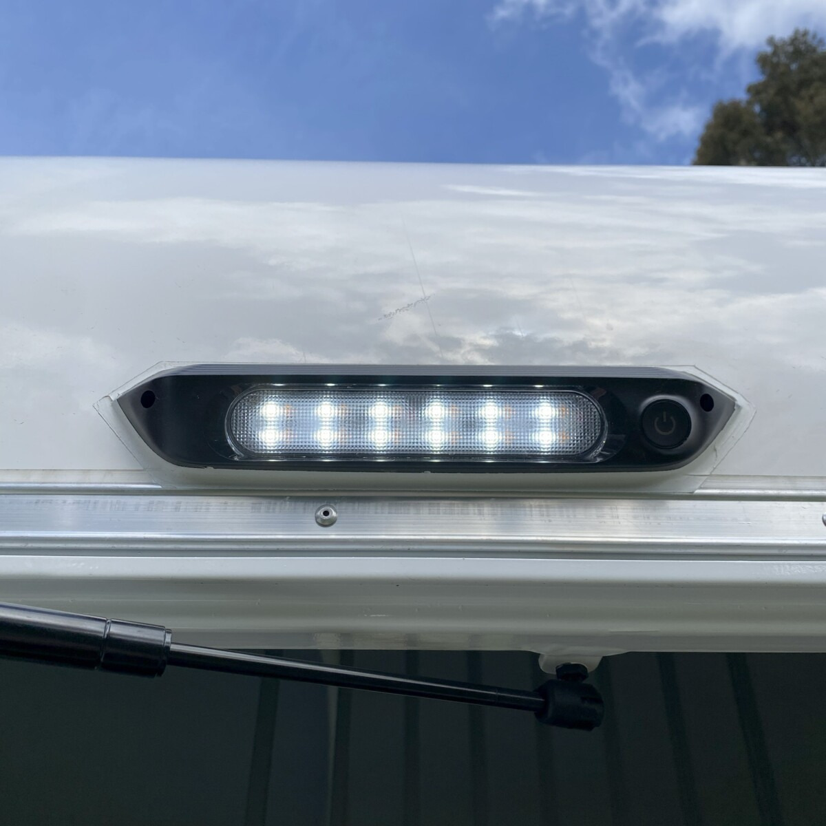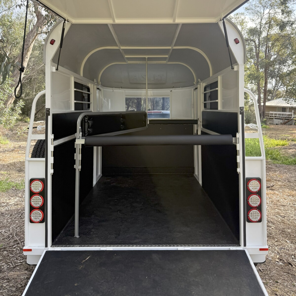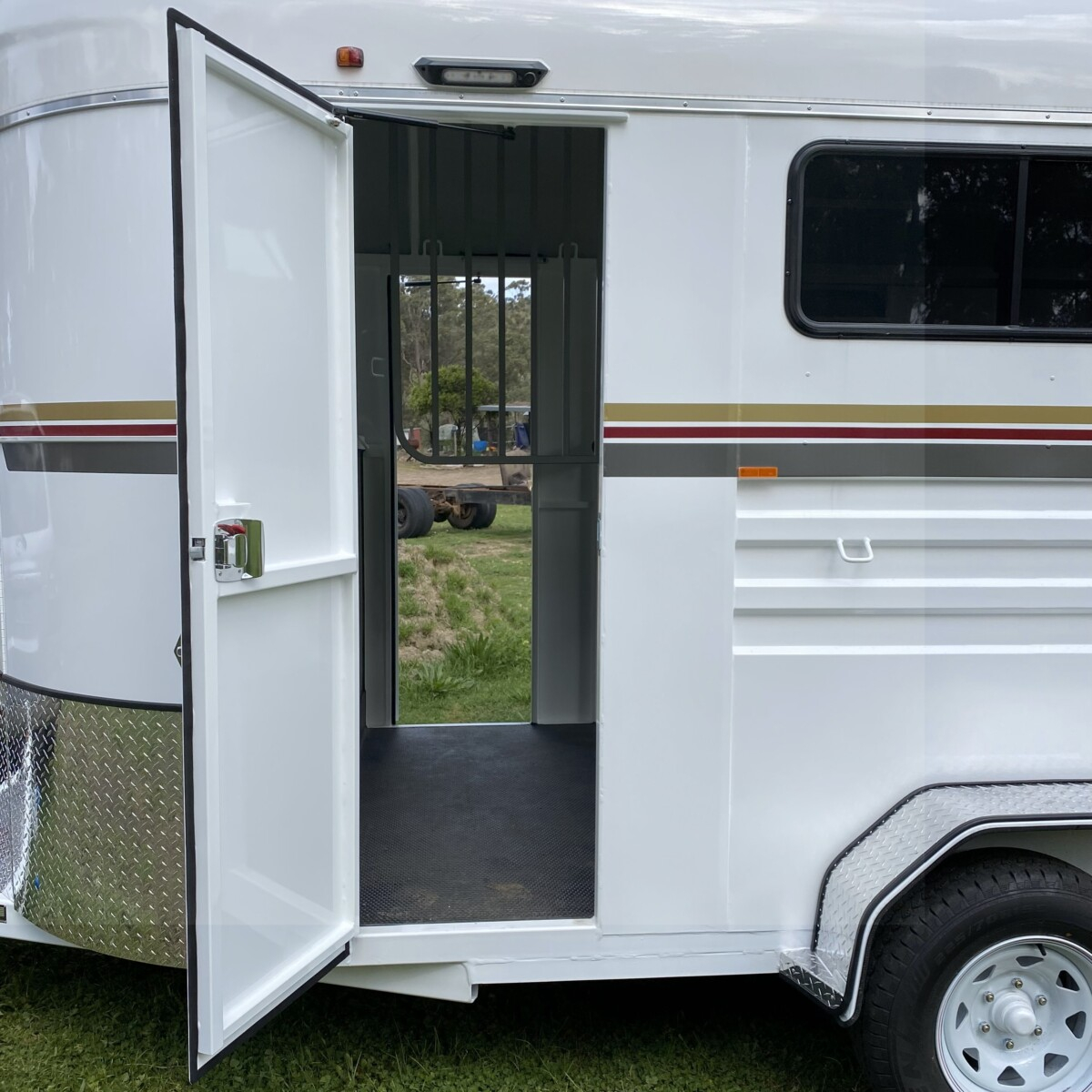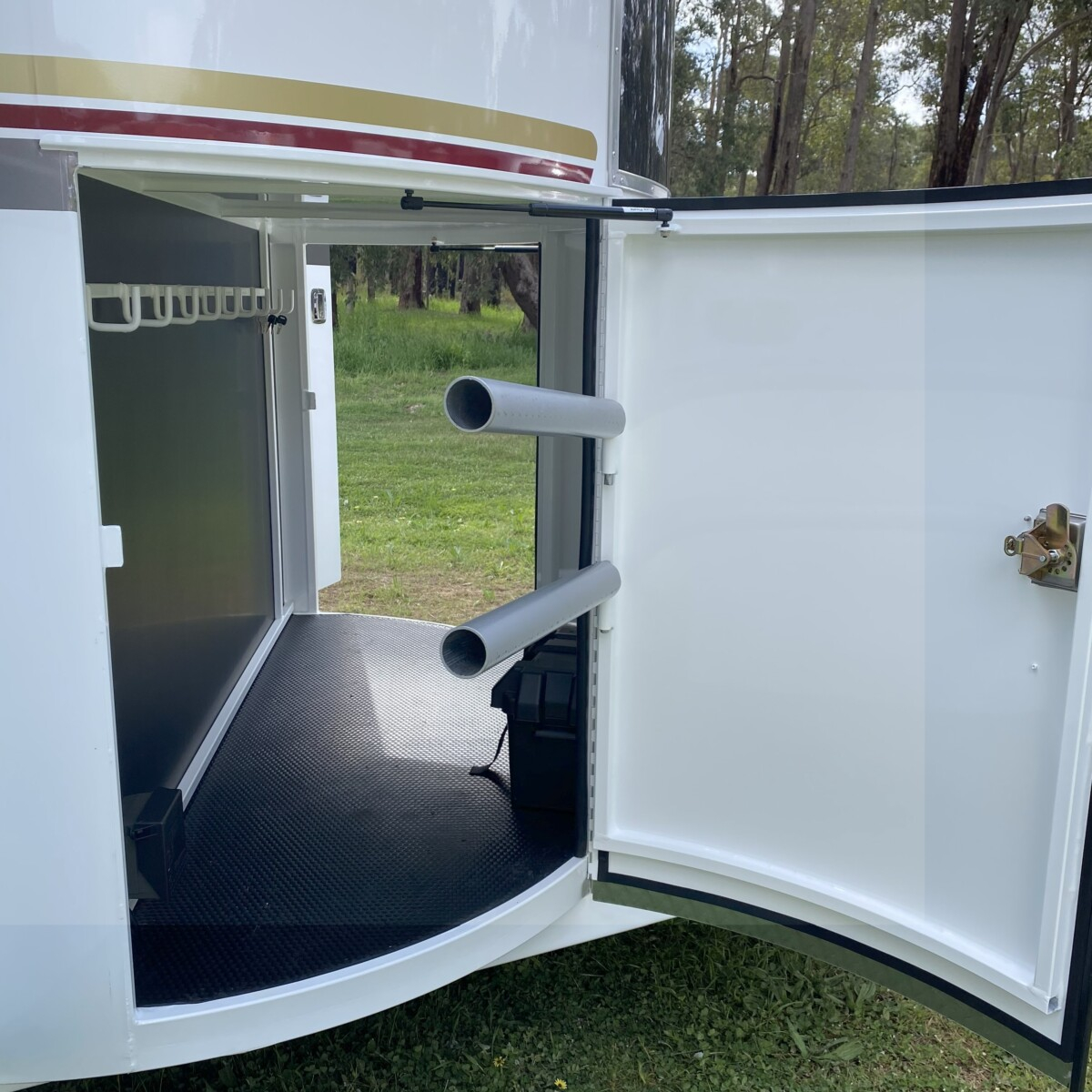 Rear gas lift up door with rod to stay slightly open when travelling for airflow